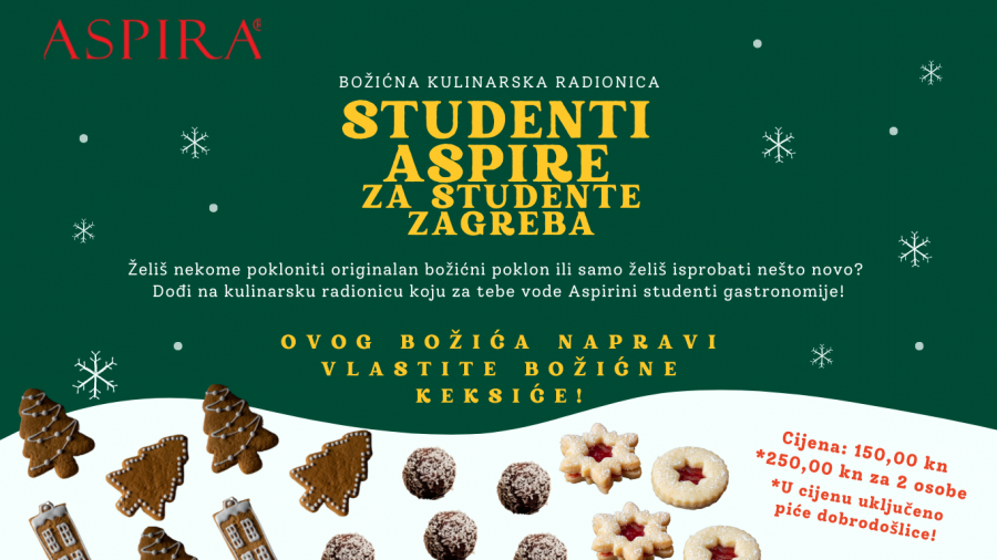 Želiš nekome pokloniti originalan božićni poklon? Ili samo želiš isprobati nešto novo, provesti ugodno popodne i zabaviti se pečenjem svima dragih božićnih kolačića? Dođi na kulinarsku radionicu koju za tebe vode Aspirini studenti gastronomije!